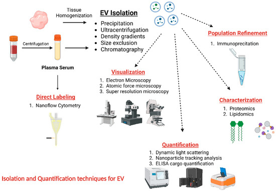 Isolation and quantification techniques for EVs. The diagram illustrates frequently employed methods for analyzing EVs. EVs can be quantified in tissue homogenates and natural fluids, such as urine, saliva, and blood. The isolation of plasma or serum from blood is utilized in this context as an illustrative case. Nanoflow cytometry enables direct labeling and quantifying EVs in various fluid samples. In contrast, EVs have the potential to be separated and subsequently utilized for further analysis. Immunoprecipitation is a technique that can be employed to enhance the specificity of EV populations. EVs can be observed using electron microscopy (EM) or alternative high-resolution microscopy methodologies. Lipidomics and proteomics methodologies can also be utilized to analyze and describe the composition of EVs populations. Ultimately, EV concentration and size measurement can now be achieved through dynamic light scattering and nanoparticle tracking analysis. Additionally, EV products can be measured by employing susceptible protein or RNA assays. Created with BioRender.com (https://app.biorender.com/illustrations/649b163862468f1db106b519, Accessed date: 7 August 2023).
