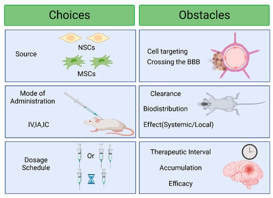Choices and obstacles while using EVs. The application of EVs originating from diverse cellular origins is commonly observed in managing stroke. The properties of EVs associated with each cell type may have varying levels of tropism for brain vasculature or neuronal cells, which could impact their ability to target the brain effectively. However, a complete evaluation of these properties has yet to be conducted. Crossing the blood–brain barrier (BBB) poses a significant challenge. The method of administration affects the biodistribution and clearance of EVs and can also impact the effect’s nature, i.e., whether it is localized or systematic. Lastly, the dosing schedule can be single or repeated, affecting accumulation and efficacy. Created with BioRender.com (https://app.biorender.com/illustrations/647df1821b2f09af295c29aa, accessed Date: 5 June 2023).