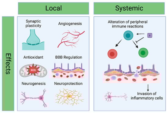 The role of natural EVs in the pathophysiology of stroke. The management of stroke has shown benefits through direct local effects in the brain, such as neuroprotection, neurogenesis, angiogenesis, antioxidant and anti-inflammatory properties, and systemic effects by modulating peripheral immune system responses. These effects may create a favorable environment for cerebral regeneration. Created with BioRender.com (https://app.biorender.com/illustrations/647df0bfe74d4f82a5bc4ade, accessed: 11 June 2023).