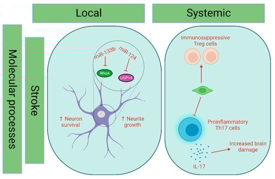 The therapeutic efficacy of EVs in stroke is primarily attributed to the molecular mechanisms involving microRNAs (miRNAs) present within these vesicles. Typically, in vitro experiments evaluate the direct impact of EVs on neuronal cells. They promote neurite outgrowth in nerve cells, and the inhibition of the growth factor for connective tissue in astrocytes was observed upon exposure to miR-133b-containing EVs released by mesenchymal stem cells (MSCs). This effect was attributed to the suppression of RhoA by the EVs [87,88]. Furthermore, it has been discovered that EVs containing miR-124, released by M2 microglia cells, can increase neuronal survival in vivo. The downregulation of ubiquitin-specific protease 14 is regulated to achieve the desired result. However, whether the effect is direct or systemic is still being determined since there is no apparent connection between transfected cells and the downregulation of ubiquitin-specific protease 14 (Figure 6).