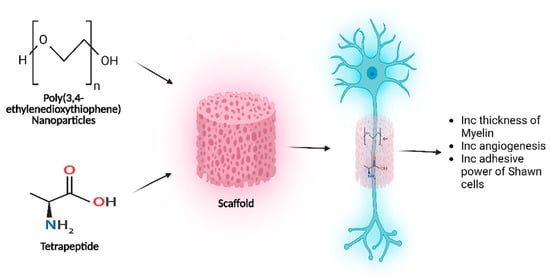 EV/NP. Transport Neural Remodeling. Poly(3,4-ethylenedioxythiophene) modified with tetrapeptide was administered utilizing a biocompatible chitin scaffold. In an in vivo model, myelin thickness increased, indicating nerve regeneration. At the injury’s site, Schwann cell adhesiveness and angiogenesis increased. Created with BioRender.com (https://app.biorender.com/illustrations/64a80816d2fc5a3659e189a9, accessed: 7 July 2023).