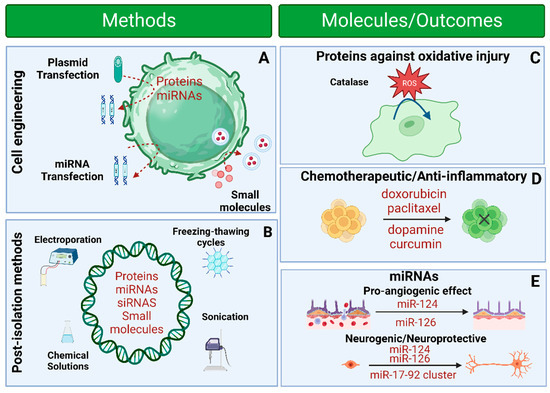 Engineering strategies for modifying EV content. Cellular engineering techniques can regulate EVs, including altering primitive cells or directly loading them via various post-isolation methods. (A) Cell engineering uses genetic manipulation techniques, such as plasmid transfection or enriching cells with miRNAs or small compounds, to load a parent cell indirectly. (B) Electroporation, sonication, freeze–thaw cycles, and chemical agents modulate isolated EVs post-isolation. Therapeutic substances and loading efficiency determine the optimum EV modulation strategy. EVs cargo manipulation can treat stroke by acting on cargo type. (C) Proteins. (D) Small molecules. (E) miRNAs. Created with BioRender.com (https://app.biorender.com/illustrations/647dfe244f0c62bb59ac8cb8, accessed: 6 June 2023).
