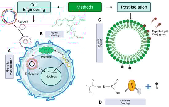 Surface modulation of EVs. The modulation of EV surfaces can be accomplished by genetically modifying the cells that produce them. (A) Protein plasmids or (B) Protein-residues (C) directly conjugated to lipids that are then integrated into EV membranes. (D) Bio-orthogonal chemistry identifies extracellular vesicle functional groups. Created with BioRender.com (https://app.biorender.com/illustrations/6480cf6ae6947f82704ea72e, accessed: 11 June 2023).