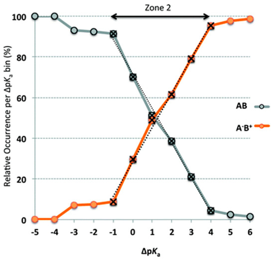 Relationship between the relative occurrence of co-crystals (AB neutral (grey)) and salts (A−B+ ionic (orange)) and the calculated ΔpKa. Reprinted with permission from ref. [71]. Copyright 2012 Royal Society of Chemistry.