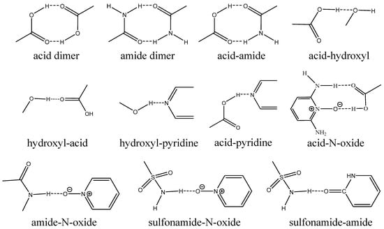 Recognizing supramolecular interactions is crucial for designing crystals. After introducing the term “crystal engineering” in 1989, Desiraju [72] introduced the term “supramolecular synthons” and defined them as structural entities within supermolecules (i.e., complexes of two or more molecules that are non-covalently bonded) that can be created and/or arranged through intermolecular interactions using existing or feasible synthetic methods. Supramolecular synthons can serve as a design strategy for controlling the self-assembly of molecules through non-covalent interactions in the solid state. These synthons play a fundamental role in the formation of co-crystals because they act as building blocks in supramolecular chemistry, guiding the arrangement and organization of molecules in the solid state. Supramolecular synthons can be divided into two categories: homosynthons and heterosynthons (Figure 4). Supramolecular homosynthons consist of the same complementary functional groups that can form self-association motifs, such as dimers or chains, including acid-acid [73] and amide-amide [74] interactions. Supramolecular heterosynthons consist of diverse but complementary functional groups, including acid-amide [75], acid-hydroxyl [76], hydroxyl-pyridine [77], acid-pyridine [28], acid-N-oxide [70], amide-N-oxide [78], sulfonamide-N-oxide [79], and sulfonamide-amide [80] interactions. In a study conducted by the CSD, the hierarchy of supramolecular heterosynthons, involving carboxylic acids and alcohols, was evaluated in competitive environments, i.e., considering that both carboxylic acid and hydroxyl groups compete to form hydrogen bond motifs [28]. It was found that supramolecular heterosynthons (COOH···Narom and OH···Narom) are preferred over the corresponding supramolecular homosynthons (COOH···COOH and OH···OH). Supramolecular synthons enable the prediction of the possible interactions between different molecules and the assessment of their propensity to form stable co-crystals. Through the analysis of complementary synthons in the molecular components, it becomes possible to narrow down the potential co-formers for a given target molecule.