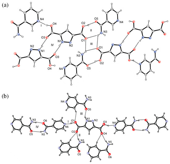 Four different synthons present in nicotinamide (a) and isonicotinamide (b) co-crystals with 3,5-pyrazole dicarboxylic acid. Reprinted with permission from ref. [32]. Copyright 2011 American Chemical Society.