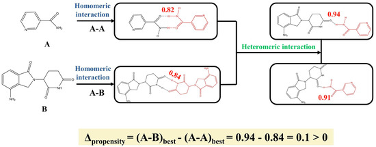 HBP was developed by the Cambridge Crystallographic Data Centre and has been integrated into the Mercury program [91] to identify donors and acceptors forming usual or unusual hydrogen bonds. Molecules from the CSD with certain functional groups were used to prepare a dataset to train statistical models [41]. When predicting co-crystallization between an API and a co-former, both homomeric and heteromeric interactions are taken into account. If HBPAPI-co-former is larger than HBPAPI-API and HBPco-former-co-former, co-crystallization is likely to occur [92]. In Figure 7, A and B are two different molecules. A-A and B-B are homomeric interactions within A and B molecules, respectively. A-B and B-A are two different heteromeric interactions between A and B molecules. The Δpropensity value is calculated as the difference of largest heteromeric interactions and largest homomeric interactions as shown in Equation (6).