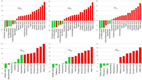 The Elatt of the crystal can be calculated by three methods [97]: the first one is using a set of programs for crystallography, FlexCryst [98], to calculate free energy G. The second approach is using cohesive energy [99], and the last one is using total energy resulting from noncovalent, pairwise interactions between the molecule and its surrounding molecules [100]. Chan et al. [96] performed lattice energy calculations and investigated the thermodynamic stability of 102 multicomponent crystal forms containing nicotinamide, isonicotinamide, and picolinamide, 99 of which (more than 97%) were consistent with the observed tendency of the compound to crystallize. Kuleshova and co-workers [101] used the FlexCryst program suite to calculate the free energy and determine the relative stability of co-crystals of flavonoids and their pure crystal forms taken from the CSD. It was found that the lattice energy calculation was a valuable tool for in silico screening of co-crystal formation and stability, which can further be used to estimate their relative solubility. Sun and co-workers [102] proposed virtual co-former screening approaches, taking into account the lattice packing contributions of crystals to screen co-formers for indomethacin and paracetamol. If the lattice energy difference is ranked from smallest to largest, successful co-crystal formation can be found in the first six values of the lists (Figure 9). Lattice energy can also be used to determine the stable form of co-crystals. Surov et al. [103] compared the theoretical lattice energies and found that in multicomponent crystal forms of fluconazole with 4-hydroxybenzoic acid, hydrated crystal forms are more energetically favorable than the anhydrous co-crystals. Moreover, based on energy calculations, Vener and co-workers [97] found that the range of supramolecular synthons is approximately ~80 to ~30 kJ/mol, with a decreasing order of strength as follows: acid–amide > acid–pyridine > hydroxyl–acid > amide–amide > hydroxyl–pyridine.