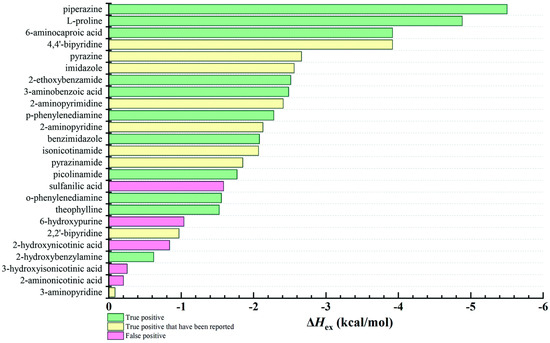 MC is mostly used as a preliminary screening tool instead of being used solely to determine the formation of multicomponent crystal forms. For example, Li et al. [106] used both COSMO-RS and MC in screening the formation of new multicomponent crystal forms of 2,4-dichlorophenoxyacetic acid. In total, 25 out of the 53 co-former candidates were identified to be potential co-formers, among which 20 co-formers were experimentally successful in forming new multicomponent crystal forms with 2,4-dichlorophenoxyacetic acid (Figure 11). Wu et al. [65] evaluated COSMO-RS, MC, HSP and their combinations in screening multicomponent crystal forms of 2-amino-4,6-dimethoxypyrimidine with 63 components. The overall successful rate of MC was 69.8%, and the best outcomes were obtained when using MC and COSMO-RS, with an overall success rate of 85.7%. Wu et al. [64] also used a combined method (COSMO-RS and MC) to screen multicomponent crystal forms for a pesticide, pymetrozine, with 39 co-former candidates. The calculation resulted in 13 promising co-formers, and it was discovered that nine of them produced novel solid phases.