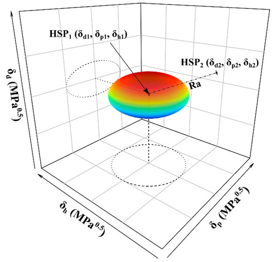 Three parameters representing hydrogen bonding, polarity, and dispersion forces can be considered as three-dimensional coordinates of HSP space points. The two components are miscible if ≤ 5 MPa0.5. For the purpose of convenient visualization of the spherical, instead of using the ellipsoidal solubility plot, a modified radius (Ra) equation (Equation (15)) was proposed [119] as a representation of the Euclidean distance between the centrum HSP1 (δd1, δp1, δh1) and another point HSP2 (δd2, δp2, δh2) in the Hansen space (Figure 12).