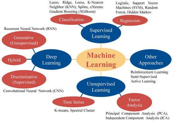 In recent years, AI methods, especially machine learning (ML), have emerged as promising and effective strategies to predict both multicomponent crystal forms and co-amorphous systems [130]. This method is mainly based on molecular descriptors representing the physicochemical properties of a molecule which are computed according to its chemical structure. Figure 14 displays the ML approaches commonly used. Building data sets based on experimental data is the first step in ML [131]. Molecules are characterized using artificial molecular features (such as molecular fingerprints and descriptors) or automatically extracted features (e.g., convolutional neural networks). ML algorithms are used to learn how a specific system is formed and include the creation and evaluation of models. The combination of AI with complementary experimental studies allows the leverage of the computational capabilities of AI to analyze vast amounts of data, identify patterns, and generate predictive models. Moreover, when AI predictions are complemented by experimental validations, it is possible to validate and refine these models, leading to a more comprehensive understanding of the underlying mechanisms of the formation of multicomponent solid forms. This may significantly reduce the time and cost of developing effective drugs [131], by creating a cluster analysis for co-former screening [132] and predicting the formation of multicomponent solid forms based on principal component analysis [133] and multivariate adaptive regression splines [134,135].