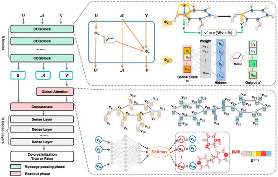 The main limitation in applying deep learning (DL) approaches in crystal engineering lies in the critical bottleneck of data availability, while the model performance also heavily relies on the key factor of data quality. The CSD comprises an extensive repository of high-quality positive samples (i.e., examples of successful multicomponent solid state form formation), providing valuable support for DL applications [130]. In data collection and augmentation, ML methods retrieve positive sample data from the CSD. Negative samples, however, are collected from experiments or experimental reports [130], or by computational methods such as network-based link prediction [135] and molecular similarity-based methods [57]. These data can be used to train ML models. Gröls et al. [56] developed different ML algorithms based on 1000 co-crystallization events and 2083 chemical descriptors to accurately predict mechanochemical co-crystallizations. The eXtreme Gradient Boosting model was able to identify three new co-crystals of diclofenac through mechanochemistry. Similarly, they developed and compared different machine learning and deep learning algorithms based on 418 experimental amorphization cases and 2066 molecular descriptors to predict mechanochemical amorphization [59]. The gradient boost model showed an accuracy of over 73% and was able to identify six novel co-amorphous systems with folic acid. Jiang et al. [130] used 6819 positive and 1052 negative samples to develop a graph neural network based on a deep learning model, as shown in Figure 15. The effectiveness of the graph neural network was shown by seven competitive models and three different and challenging out-of-sample tests, achieving prediction accuracy of higher than 96%. Wang et al. [57] developed a co-crystal prediction model based on the random forest approach. The positive samples were from the CSD and the negative ones were created by randomly combining different molecules into chemical pairs. The effectiveness of the model was shown by the formation of two co-crystals of captopril with l-proline and sarcosine. Przybyłek et al. [134] developed a MARSplines algorithm model containing 1D and 2D molecular descriptors and validated it for phenolic acid co-crystals. In a study of Meng-Lund et al. [62], molecular descriptors were computed for six APIs (carvedilol, mebendazole, carbamazepine, furosemide, indomethacin, and simvastatin), as well as for 20 naturally occurring amino acids, to build a partial least squares discriminant analysis (PLS-DA) model. Although this model was capable of accurately predicting 19 out of 20 mebendazole–amino acid co-amorphous combinations, it was limited to the use of amino acids as co-formers.