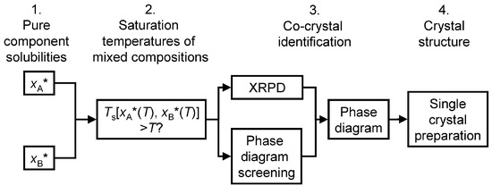 Steps for screening the formation of co-crystals based on the solubility of the pure components. Reprinted with permission from ref. [137]. *: at constant temperature. Copyright 2009 American Chemical Society.