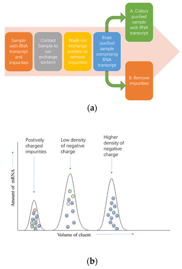 Ion exchange HPLC (IEC) is another effective method for the large-scale purification of IVT mRNA. Given the polyanionic nature of mRNA molecules, ion exchange matrices have been extensively explored for chromatographic separation according to the charge difference between the target mRNA species and the different impurities [84]. The crude transcription reaction is applied directly to weak anion-exchange chromatography, and T7 RNA polymerase and unincorporated NTPs, which do not bind to the column matrix, are found in the flow-through. Small abortive transcripts, the desired RNA product, and the plasmid DNA template are separated on the column over a shallow salt gradient (Figure 6a,b) [85]. Since IEC separation is carried out under aqueous conditions without using expensive eluents, it is scalable and cost-effective. IEC chromatography is commonly used for oligonucleotide purification in medium- to large-scale manufacturing processes [70].