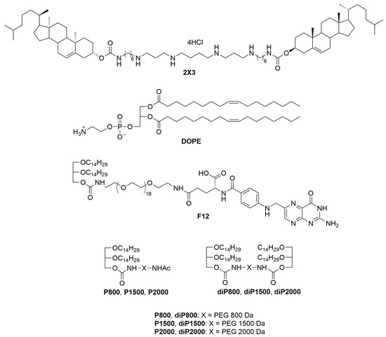 Structures of cholesterol-based polycationic amphiphile 1,26-bis(cholest-5-en-3_-yloxycarbonylamino)-7,11,16,20-tetraazahexacosan tetrahydrochloride (2X3), lipid helper dioleoylphosphatidylethanolamine (DOPE), lipoconjugates: O,O′[rac-2,3-di(tetradecyloxy) propyl-1-oxycarbonylamino] octadecaethylene glycol (P800), O,O′-bis[rac-2,3-di(tetradecyloxy) propyl-1-oxycarbonylamino] octadecaethylene glycol (diP800), O,O′[rac-2,3-di(tetradecyloxy) propyl-1-oxycarbonylamino] poly(ethylene glycol1500) (P1500), O,O′-bis[rac-2,3-di(tetradecyloxy) propyl-1-oxycarbonylamino] poly(ethylene glycol1500) (diP1500), O,O′[rac-2,3-di(tetradecyloxy) propyl-1-oxycarbonylamino] poly(ethylene glycol2000) (P2000), O,O′-bis[rac-2,3-di(tetradecyloxy) propyl-1-oxycarbonylamino] poly(ethylene glycol2000) (diP2000) and O-{2-[rac-2,3-di(tetradecyloxy) prop-1-yloxycarbonyl]aminoethyl}-O′-[2-(pteroyl-L-glutam-5yl)aminoethyl]octadecaethyleneglycol (F12) is used for liposome preparation.