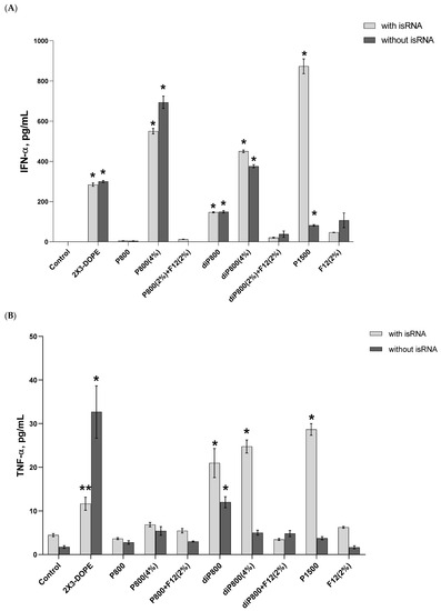 Thus, we demonstrated that the structure of the delivery system plays a vital role in determining the immune response to isRNA; adding lipoconjugates can change the spectrum and the levels of the effects produced by immunostimulating RNA and allows for the choice of a delivery system depending on the desired effect.