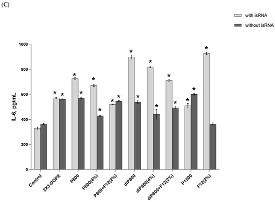 A slight increase in the level of TNF-α (up to 33 pg/mL) was detected at the 16-h time point; this increase was induced by the 2X3-DOPE core system and isRNA complexes with diP800 (2 and 4%) and P1500, and these liposomes themselves did not cause such an effect. A moderate rise in the level of IL-6 was observed 6 h after transfection; higher levels were observed for isRNA complexes with diP800 and F12 (Figure 2C). The levels of IL-6 in cells transfected with P1500 and isRNA/P1500 are slightly elevated and do not differ significantly from the levels in untreated cells (Figure 2C). diP800 (2%) and isRNA/diP800 (2%) induced an approximately 3-fold increase in the levels of IL-6. Given the observed results, the isRNA/P1500 formulation proved to be the most favorable since it did not cause a pronounced activation of pro-inflammatory cytokine secretion, providing specific and efficient IFN-α production (Figure 2A).