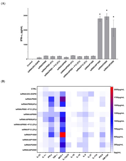 Cytokine production in CBA mice (n = 3) 6 h after i.v. administration of isRNA/liposomes complexes. (A) Serum IFN-α levels measured via ELISA. The data represent mean ± standard deviation (SD) calculated from samples from three mice measured in duplicates. Statistically significant differences between experimental groups and the control group are indicated by asterisks (* p < 0.001); ordinary two-way ANOVA, Dunnett’s multiple comparisons test. (B) Cytokine profiling measured using LEGEND plex™ Mouse Inflammation Panel (13-plex) kit. Numerical data are presented in Supplementary Data Table S1.