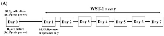 P2000 PEG-containing and non-PEGylated 2X3-DOPE formulations were used for the investigation of the antiproliferative effects of isRNA/P2000 and isRNA/2X3-DOPE on tumor cells of different origins. Cell lines from different tissue origins, namely melanoma B16 and drug resistant lymphosarcoma RLS40, were selected for this experiment since they are tumorigenic in syngeneic mice and can be used further for antitumor activity assessment in vivo. The experimental scheme is depicted in Figure 4A. The cells were plated on 6-well plates one day before transfection in triplicate, and the number of living cells was assayed via WST-1 test at days 2–7.