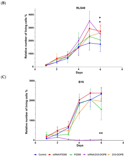 During the observation period, RLS40 cells grew exponentially and did not show any statistically significant response to the treatment with isRNA/liposomes or liposomes alone. The number of living cells in isRNA/liposome-treated groups was equal to that in the vehicle group and, at some time points, even slightly exceeded the number of cells in the untreated control group (Figure 4B). A completely different picture is observed in the case of melanoma B16 cells: the number of living cells treated with isRNA/2X3-DOPE decreased profoundly in comparison with both the control group and the corresponding vehicle group the next day after transfection. P2000 slightly inhibited cell growth over the first three days after treatment, but in the following days, the cells recovered and grew similarly to other groups. The isRNA/P2000 complexes had almost no effect on the cell proliferation rate (Figure 4C). Such a difference in the behavior of “responding” and “non-responding” tumor cells can arise from both the characteristics of the cells themselves associated with their tissue origin, such as the presence of recognizing receptors and components of the downstream signaling pathways [31], as well as the different efficiency of isRNA accumulation in cells.