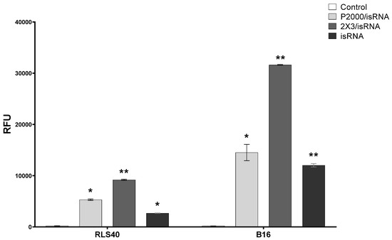 Accumulation of Cy5.5-isRNA and its complexes with liposomes in B16 and RLS40 cells. The accumulation was measured 4 h after transfection of Cy5.5-isRNA mediated by liposomes using flow cytometry. Statistically significant differences between experimental groups and control group are indicated by asterisks (* p < 0.005, ** p < 0.0001); ordinary two-way ANOVA, Dunnett’s multiple comparisons test. RFU—Relative Fluorescence Unite.