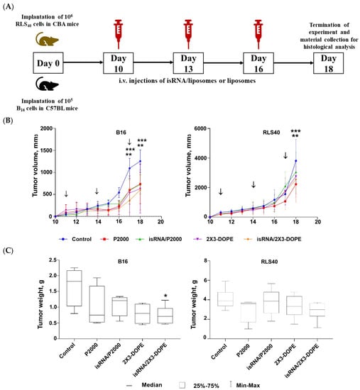 Antitumor activity of isRNA/liposomes in the lymphosarcoma RLS40 and melanoma B16 mouse models. (A) Experimental setup. (B) Dynamics of tumor growth (n = 5 mice per group). (C) Average tumor weight at the end point of the experiment. The arrows indicate the day when mice received injections. Statistically significant differences between experimental groups and the control group are indicated by asterisks (* p ˂ 0.05 compared to control group, ** p < 0.0005 for P2000 and isRNA/P2000 treated mice compared to the control group, *** p < 0.0001 for 2X3-DOPE and isRNA/2X3-DOPE compared to the control group); ordinary two-way ANOVA, Dunnett’s multiple comparison test.