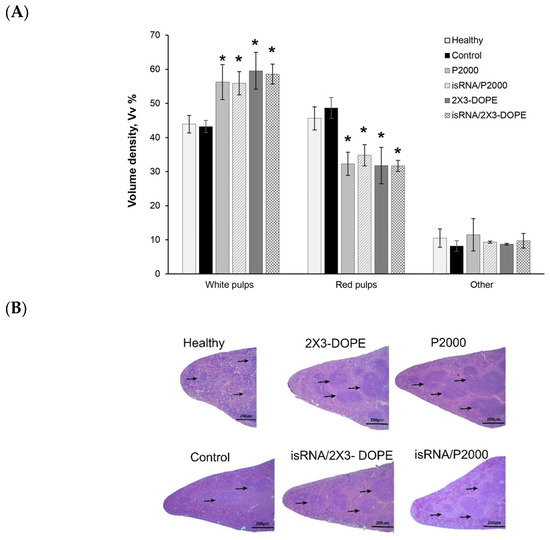 The effect of isRNA/liposome on spleen tissue from mice with melanoma B16. (A) Morphometry data of spleen from C57BL\6 mice bearing melanoma B16. Volume density of white and red pulp in spleen tissue after 3 injections of isRNA/liposomes or liposomes only. (B) Representative histological images of the spleen sections. Hematoxylin and eosin staining. Black arrows indicate lymphoid follicles in the spleen. Original magnification ×100. The data represent mean ± standard deviation (SD) calculated from measurements from five mice in each group. Statistically significant differences between experimental groups and the control and healthy groups are indicated by asterisks (* = p value < 0.001); ordinary two-way ANOVA, Dunnett’s multiple comparisons test. Scale bar corresponds to 200 µm.
