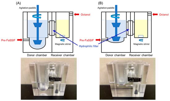 The BE Checker was developed to assess the dissolution of the drugs from the formulations and their membrane permeation by reproducing the environmental changes in the GI tract by altering the pH, composition, and volume of the fluid in a donor chamber and simultaneously assessing drug transport through the hydrophilic filter into the octanol in a receiver chamber (Figure 1A) [20]. A hydrophilic filter with a pore size of 0.22 µm (Durapore®, Merck Millipore, Burlington, MA, USA) was mounted between the chambers. The effective surface area of the filter was 6.60 cm2. Both chambers were made of acrylic plastic. For the evaluation of the CTs taken with water, the fluid volume of the donor chamber was 40 mL in the bottom, which corresponds to the stomach, and 100 mL in total (Figure 1A). As the BE Checker was designed as a 1/4 scale of the human GI tract in volume, 40 mL was set for the volume of the bottom of the donor chamber. This is about 1/4 of the total volume of 150 mL, the recommended volume of the administered water in BE studies in Japan [21], and 30 mL of the resting volume in the stomach. Assuming that the total volume of the fluid in the small intestine to which drugs were exposed was about 400 mL, the final volume in the donor chamber was set to 100 mL. For the evaluation of ODTs taken without water, the fluid volume of the donor chamber was 5 mL in the bottom and 65 mL in total (Figure 1B).