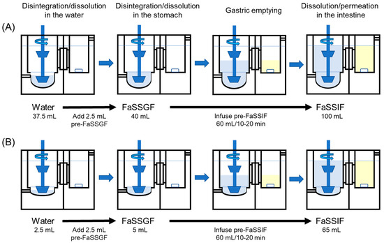 Before conducting in vivo BE studies in healthy volunteers, the drug dissolutions from the formulations are evaluated by an in vitro compendial dissolution apparatus to confirm their characteristics. Those compendial dissolution methodologies conducted with fixed conditions in terms of pH, volumes, and fluid components are useful for the quality assurance of drug products. However, because they do not reflect dynamic gastrointestinal (GI) processes, such as the transit of the dissolved drugs or formulations and the fluid shift from the stomach to the small intestine, and bile acid secretion into the small intestine, the in vivo performance of the drug formulations with pH-dependent dissolution may not be evaluated precisely. Weakly basic drugs often supersaturate in neutral pH after the fluid shift from acidic conditions, and bile acids in the small intestine significantly promote drug dissolution. In addition, the excipients in the formulation often affect the behavior of supersaturation and dissolution of the drugs. To overcome these limitations, biorelevant dissolution methodologies—such as a two-stage, single-compartment model [3,4,5,6]; a transfer model [7,8]; a gastrointestinal simulator [9,10,11,12,13,14,15,16,17]; and an artificial stomach–duodenum model [18,19]—have been developed. Except for a single-compartment model, these models have two or three compartments representing the dynamic physiological changes from the stomach to the small intestine. Pumps are used to transfer fluids between the compartments. They have successfully simulated the performance of formulations in the GI tract, but suffer from complex setups and low system throughput. In our previous study, we developed an in vitro bioequivalence checking system (BE Checker), which reproduces the fluid shift from the stomach to the small intestine by simply adding concentrated simulated intestinal fluid into the simulated gastric fluid in a single chamber [20]. In addition, the membrane permeation of the dissolved drugs through the hydrophilic filter to the receiver chamber filled with octanol can be evaluated simultaneously. We have applied the BE Checker to assess the formulation performance of oral drug products and demonstrated that it enabled the assessment of drug dissolution and permeation profiles from the formulations under various GI conditions by changing the pH, fluid composition, infusion rate, and stirring rate, reflecting those in healthy and special populations. An approved naftopidil CT and ODT (Flivas®) were used as standard drug products, and the experimental conditions for the administration with a glass of water were optimized. In the case of Flivas® ODT, disintegration in the administered water was necessary to avoid the dissolution delay by forming a gel-like layer on the surface of the ODTs when they were administered directly into the acidic simulated gastric fluid.