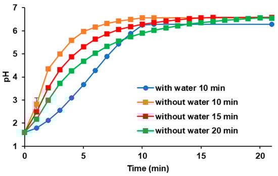 In addition to the difference in fluid volumes, the difference in the gastric emptying time was considered. Table 1 summarizes the literature information on the time to maximum plasma concentration (Tmax) after oral administration of ODTs taken with or without water [24,25,26,27,28]. The Tmax of ODTs taken without water tended to be longer than that with water, and the average ratio was 1.6. Assuming that the difference in Tmax was derived from gastric emptying time, the infusion time of the pre-FaSSIF into the donor chamber in ODT tests was set at 1.5 or 2 times longer than that of the CTs taken with water. Figure 3 shows the simulated pH–time profiles of the donor fluid in the BE Checker when the initial gastric pH was 1.6 and the final intestinal pH was 6.5. Because the fluid volume in the bottom was 5 mL for the ODT evaluations, the pH shift was faster than in the CT evaluations (40 mL in the bottom) when 60 mL of pre-FaSSIF was infused into the donor chamber.