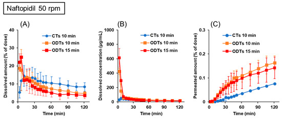 Dissolution and permeation profiles of naftopidil from 25 mg CTs and ODTs in the BE Checker when the stirring rate was 50 rpm. (A) Dissolved amount in the donor chamber; (B) dissolved concentration in the donor chamber; (C) permeated amount in the receiver chamber.