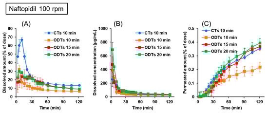 Dissolution and permeation profiles of naftopidil from 25 mg CTs and ODTs in the BE Checker when the stirring rate was 100 rpm. (A) Dissolved amount in the donor chamber; (B) dissolved concentration in the donor chamber; (C) permeated amount in the receiver chamber.