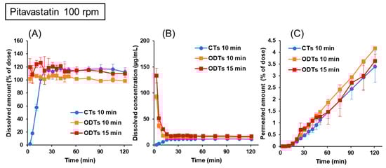 Dissolution and permeation profiles of pitavastatin from 1 mg CTs and ODTs in the BE Checker when the stirring rate was 100 rpm. (A) Dissolved amount in the donor chamber; (B) dissolved concentration in the donor chamber; (C) permeated amount in the receiver chamber.