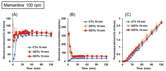 Dissolution and permeation profiles of memantine from 5 mg CTs and ODTs in the BE Checker when the stirring rate was 100 rpm. (A) Dissolved amount in the donor chamber; (B) dissolved concentration in the donor chamber; (C) permeated amount in the receiver chamber.