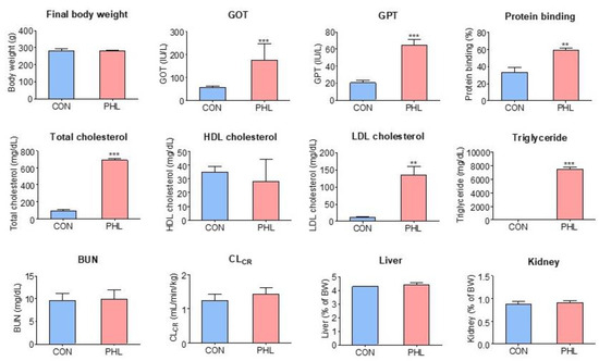 Plasma concentrations of total cholesterol, LDL cholesterol, high-density lipoprotein (HDL) cholesterol, triglyceride, blood urea nitrogen (BUN), glutamate pyruvate transaminase (GPT), and glutamate oxaloacetate transaminase (GOT) were measured in CON and PHL rats (Green Cross Reference Lab, Seoul, Republic of Korea). To evaluate creatinine clearance (CLCR), urine samples were collected for 24 h and urine volumes and creatinine concentrations were measured, with CLCR estimated by dividing the amount of creatinine excreted in the urine over 24 h by the area under the plasma concentration–time curve of creatinine from 0 to 24 h (AUC0–24 h) [26]. In addition, whole kidneys and livers were removed from CON and PHL rats and weighed, and biopsy samples were fixed in 10% neutral buffered formalin (BBC Biochemical, Mount Vernon, WA, USA).
