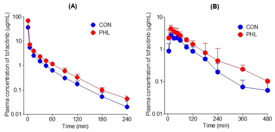 (A) Mean arterial plasma concentration–time curves of tofacitinib after intravenous administration of 10 mg/kg tofacitinib to CON (n = 7) and PHL (n = 6) rats. (B) Mean arterial plasma concentration–time curves of tofacitinib after oral administration of 20 mg/kg tofacitinib to CON (n = 6) and PHL (n = 7) rats. The bars represent standard deviations. CON, control; PHL, poloxamer-407-induced hyperlipidemia.