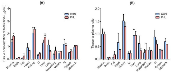 Tissue and plasma concentrations of tofacitinib, along with tissue-to-plasma (T/P) ratios, were measured 30 min after intravenous administration of 10 mg/kg of tofacitinib to CON and PHL rats (Figure 4). Tofacitinib was widely distributed in both groups, and their plasma and tissue concentrations of tofacitinib were generally comparable, except for the liver and spleen (Figure 4A). The T/P ratios of tofacitinib were lower than 1.0 in all tissues of CON and PHL rats (Figure 4B). This may have been due to the lower Vss in both CON (847 mL/kg) and PHL (490 mL/kg) rats (Table 1).
