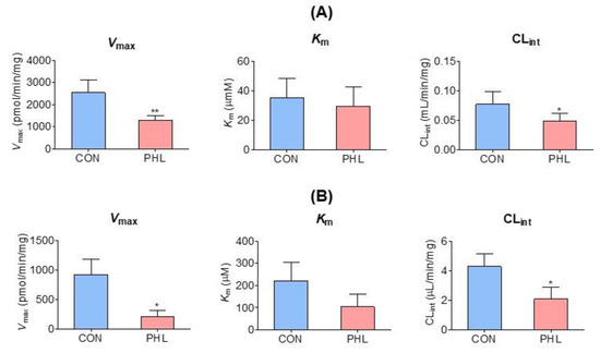 Mean (± standard deviation) Vmax, Km, and CLint for the disappearance of tofacitinib in (A) hepatic and (B) intestinal microsomes obtained from CON and PHL rats (n = 3, each). The experiments were repeated three times. Bars represent standard deviations. Vmax, maximum velocity; Km, tofacitinib concentration at one-half Vmax; CLint, intrinsic clearance; CON, control; PHL, poloxamer-407-induced hyperlipidemia. * p < 0.05 and ** p < 0.01 compared with the CON group.