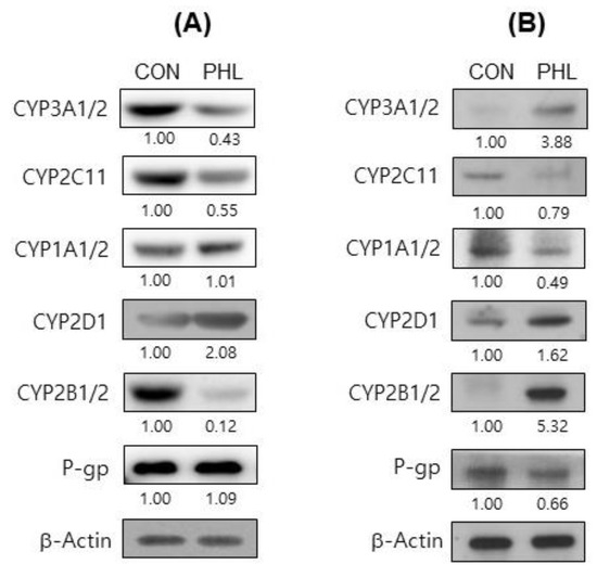 Immunoblot analyses of CYP isozymes and P-gp in (A) hepatic and (B) intestinal microsomes obtained from CON and PHL rats. β-Actin was used for the loading control. Results shown are representative of three identical experiments. Band density was determined by ImageJ 1.45s software (NIH). CYP, cytochrome P450; P-gp, P-glycoprotein; CON, control; PHL, poloxamer-407-induced hyperlipidemia.