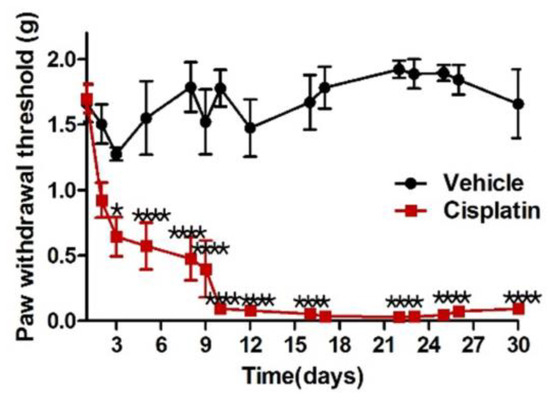 Cisplatin (2.3 mg/kg/day, Spectrum Chemical MFG., Gardena, CA, USA) was administered intraperitoneally in the mice six times, on every other day, for total dose of 13.8 mg/kg. Mice in the vehicle group received saline instead of cisplatin six times, on every other day. The protection of kidney and liver function was planned via maintaining hydration and using lactated Ringer’s solution (0.25 mL) subcutaneously between cisplatin injection days. This protocol was based on a previously validated treatment/dosing paradigm [22]. A foot withdrawal response to von Frey filaments was measured on day 15. If a response occurred under applied force of 0.6 g or less to the hind paw, the mouse was to have considered developed mechanical allodynia, and was used in subsequent experiments. Impairment in motor function or mobility was not shown in cisplatin-administered mice during the observation. There was no change in stepping reflexes, pinnae, placing, or blink reflexes.