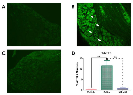 In mice treated with the vehicle, few ATF3-positive cells were observed in the DRG. Cisplatin-treated mice exhibited higher activation of neuronal ATF3 than vehicle-treated mice (p < 0.01). The ATF3 levels in the DRG were significantly lower in the Milna50 group than in the saline-injected control group. Immunohistochemistry demonstrated that milnacipran significantly suppressed the activation of neuronal ATF3 in cisplatin-induced neuropathic mice (p < 0.01) (Figure 3).
