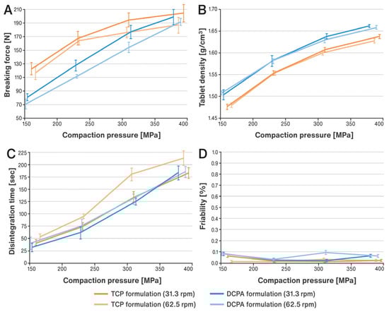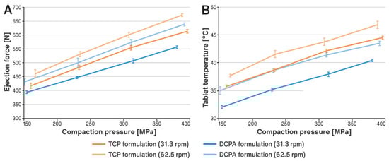 It was observed that for both formulations investigated, the increase in ejection forces resulting from the use of higher compaction pressures was accompanied by an almost linear growth in tablet temperature (see Figure 2). Ejection forces were not particularly high and did not exceed 700 N (Figure 2A); similarly, growing temperatures remained at a moderate level and did not exceed 50 °C (Figure 2B). The ejection forces and correlated tablet temperatures generated during compression were higher for the TCP formulation than for the DCPA formulation. Tableting at a faster speed (62.5 rpm) produced a greater increase in tablet temperatures in both cases. The effects described above did not cause significant changes in the content of pancreatin in the tablets produced. All results met the requirements of the USP 44–NF 39 monograph for pancreatin tablets, i.e., they contained more than 90.0% of the labeled amount of the active ingredient. Assayed contents did not form any clear trends and ranged approximately from 95% to 103% (see Figure 5A).