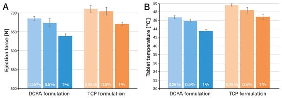 This study also analyzed the effect of reduced lubricant concentration on the ejection forces and temperature of the ejected tablets. For this purpose, the lubricant concentration was reduced to 0.5% and 0.25% compared to the formulations listed in Table 1. These changes were compensated by the amount of the main filler/diluent so as to maintain the final weight of the tablets.