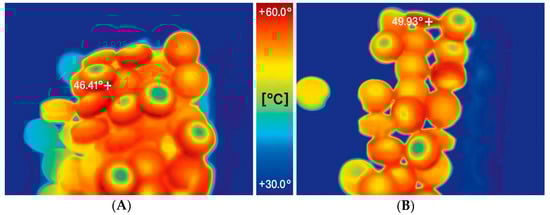 The impact of increasing compaction pressure on the ejection forces and temperature of the tablets is illustrated in Figure 2A,B. Additionally, Figure 3A,B show how these parameters are affected by decreasing lubricant concentration in the formulation. The results shown in Figure 2B and Figure 3B represent the temperature of the tablets measured on their surface immediately after being ejected from the tablet press die using an infrared thermal imaging camera. Exemplary results of measurements processed by the thermal imaging software are shown in Figure 4A,B.