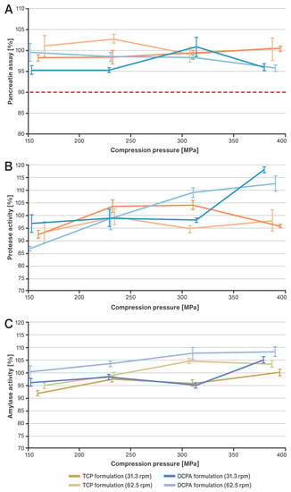 Impact of compaction pressure on pancreatin content (A), enzymatic activity of protease (B) and amylase (C). The dotted line indicates the limit required by the USP 44–NF 39 monograph for pancreatin tablets: not less than 90.0 percent of the labeled amount of pancreatin.