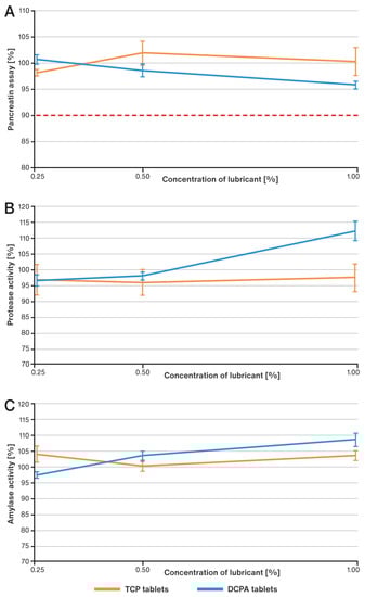 Effect of decreasing concentration of lubricant on pancreatin content (A), enzymatic activity of protease (B) and amylase (C). The dotted line indicates the limit required by the USP 44–NF 39 monograph for pancreatin tablets: not less than 90.0 percent of the labeled amount of pancreatin.