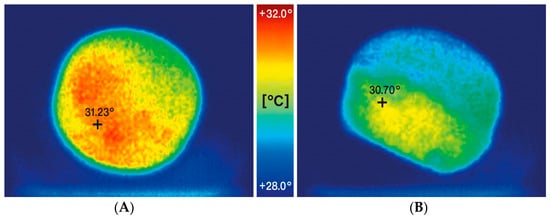 Comparison of the temperature of a tablet (DCPA formulation) compressed at 10 kN compression force measured on the surface immediately after ejection from the die (A) and inside after breaking (B); the maximum measured temperature in the first case reached 31.23 °C, in the second 30.70 °C.