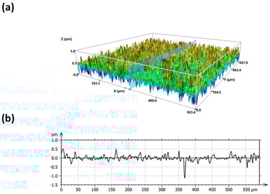 False color 3D view of SH surface (a) and a roughness profile taken from the surface by interferometric and confocal profilometer at 20× (b). The average roughness, Sa, is 180 nm.