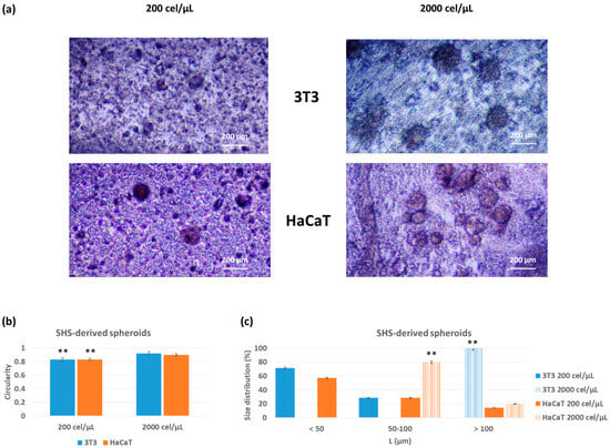 Phase contrast images (a), circularity (b) and size distribution (c) based on initial cell density (200 or 2000 cel/µL) after 48 h of incubation on highly water-repellent surfaces (SHS) for 3T3 fibroblasts and HaCaT keratinocytes. The results are reported as the average of more than 10 individual spheroids ± standard deviation. The scale bar represents 200 μm. ** (p < 0.001) indicates significant differences between initial cell density vales for the same cell line.
