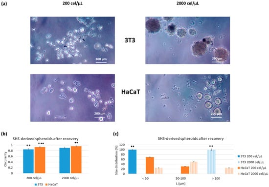 Phase contrast images (a), circularity (b) and size distribution (c) based on initial cell density (200 or 2000 cel/µL) of SHS-derived spheroids after recovery, for 3T3 fibroblasts and HaCaT keratinocytes. The results are reported as the average of more than 10 individual spheroids ± standard deviation. The scale bar represents 200 μm. * (p < 0.05) and ** (p < 0.001) indicate significant differences between initial cell density vales for the same cell line. ●● (p < 0.001) indicates significant differences between values before and after the recovery process.
